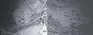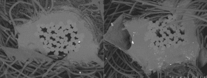 新型ノズルには2つの開口があり、2箇所からホットメルトを糸ゴムに回り込ませることが可能です。